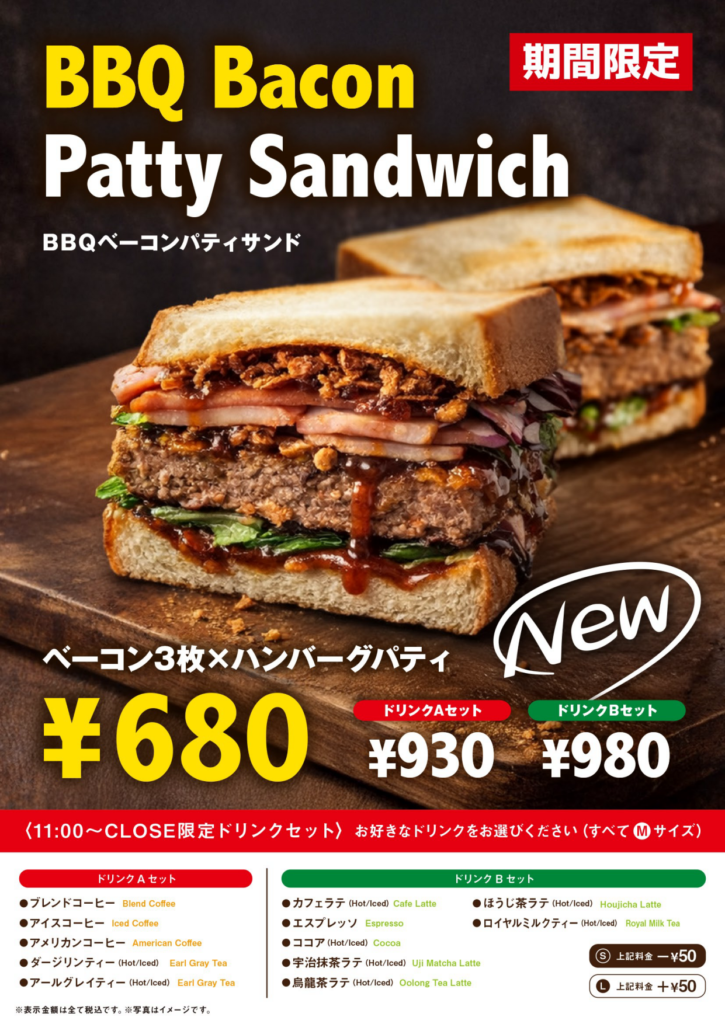 ジューシーなハンバーグパティに、香ばしいベーコンを3枚重ねた、食べ応えのある期間限定サンド。